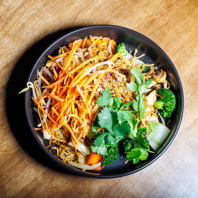 Yellow wheat noodles tossed with onions, mushrooms, carrots, broccoli, cabbage with choice of protein garnished with carrots, bean sprouts & cilantro