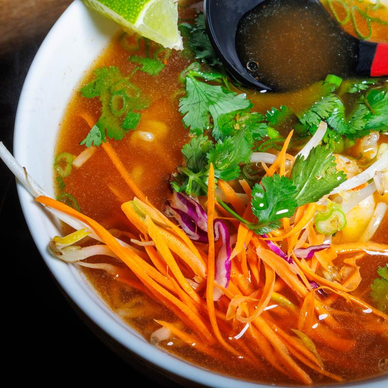 Beef broth with ramen noodles, choice of protein, garnished with bean sprouts, carrots, green onions & cilantro