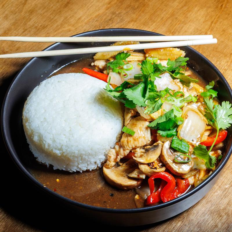 Choice of protein tossed with mango, cashews, yellow onions, carrots, mushrooms, green onions in a Bodhi sauce garnished with cilantro served with steamed rice