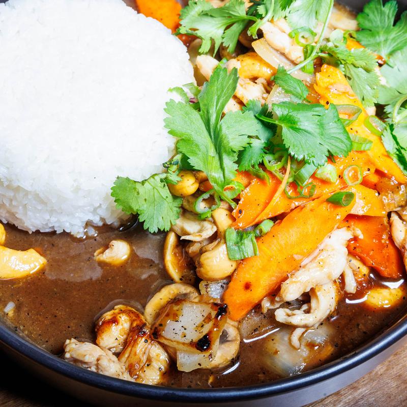 Specialty flavored curry cooked in coconut milk with cubed potatoes, carrots, onions, peanuts & choice of protein served with steamed rice
